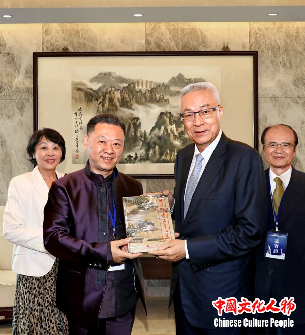 吴敦义向《黄帝内经》文化促进会会长王寅表示祝贺,希望两岸名人名家增进文化交流,共同谱写民族复兴的美好愿景