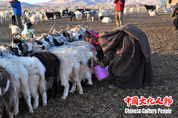 韩玉臣在藏区拍摄的挤羊奶创作素材