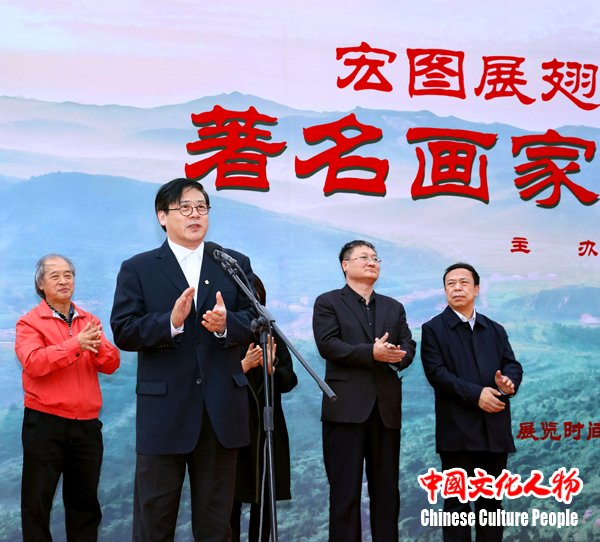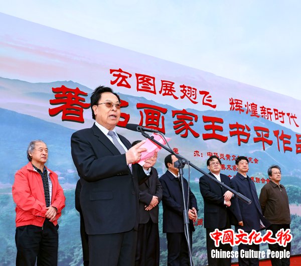 在党的十九大胜利闭幕,全国各地迅速掀起学习宣传贯彻党的十九大精神热潮,京津冀协同发展走进新时代,文化交融向更广领域、更深层次发展之际,10月28日,由中华炎黄文化研究会、中国美术家协会、天津市文学艺术界联合会、天津市美术家协会、中共迁安市委、迁安市人民政府共同主办的“宏图展翅飞 辉煌新时代——著名画家王书平作品展”在河北迁安市迁安博物馆隆重开幕。中华炎黄文化研究会首席顾问、中共河南省委原书记徐光春,全国政协常委、全国政协书画室副主任、第九届中国文联副主席覃志刚,中国文联副主席、中央文史馆常务副馆长、中国美协副主席冯远,天津市政协副主席黎昌晋,河北省政协副主席卢晓光,中国美术家协会分党组书记、驻会副主席、秘书长徐里,天津市文联党组书记、常务副主席万镜明,中华炎黄文化研究会常务副会长兼秘书长张希清,唐山市政协主席曹征平,中共迁安市委副书记李福林,迁安市人大常委会主任郝可军,迁安市政协主席李维林,中共迁安市委常委、宣传部部长郭卫民,全国政协委员、天津市文联副主席、天津市美术家协会主席王书平,以及中国美术家协会、中华炎黄文化研究会、天津市文联、唐山市和迁安市有关方面负责人和京津冀三地的美术家嘉宾出席。天津市文联秘书长商移山主持开幕式。全国政协副主席、农工党中央常务副主席刘晓峰为画展发来贺信。中华炎黄文化研究会首席顾问、中共河南省委原书记徐光春宣读贺信。中国美术家协会分党组书记、驻会副主席、秘书长徐里,天津市文联党组书记、常务副主席万镜明,中华炎黄文化研究会常务副会长兼秘书长张希清,中共迁安市委副书记李福林,全国政协委员、天津市文联副主席、天津市美术家协会主席、著名画家王书平先后致辞。