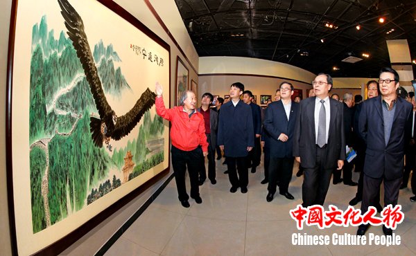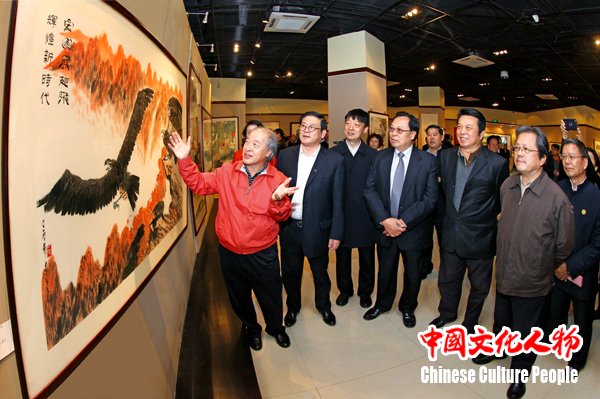 全国政协委员、天津市文联副主席、天津市美术家协会主席王书平向中华炎黄文化研究会首席顾问、中共河南省委原书记徐光春,全国政协常委、全国政协书画室副主任、第九届中国文联副主席覃志刚,中国文联副主席、中央文史馆常务副馆长、中国美协副主席冯远,天津市政协副主席黎昌晋,河北省政协副主席卢晓光,中国美术家协会分党组书记、驻会副主席、秘书长徐里,中华炎黄文化研究会常务副会长兼秘书长张希清等参观展览的领导及艺术家嘉宾介绍展览作品《宏图展翅飞 辉煌新时代》