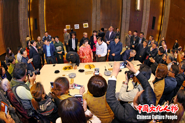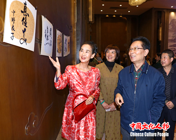 日本著名演员中野良子向中共中央宣传部原秘书长、中国政研会副会长官景辉等中日两国嘉宾介绍自己在活动现场创作的书法作品