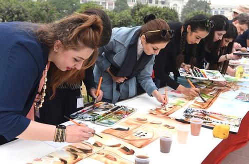 当地时间2017年12月14,印度新德里,艺术家绘制关于德里景点的75米长水墨画卷,挑战世界纪录。
