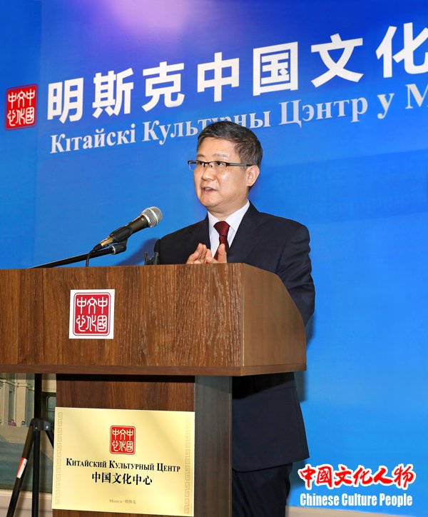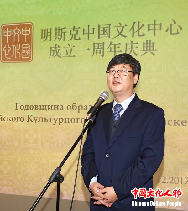中国驻白俄罗斯大使崔启明致辞,就明斯克中国文化中心一年来在传播中国文化,构建中白人民之间友谊取得的成绩表示祝贺