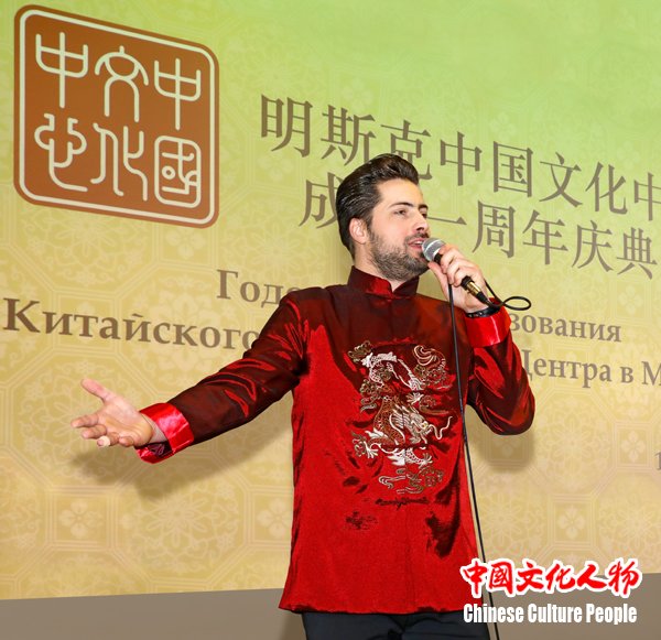 爱好中国文化的白俄罗斯青年在庆典上声情并茂地演唱中国传统歌曲