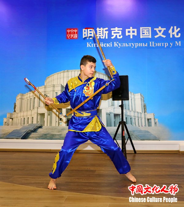 热爱中国传统文化的白俄罗斯青年在庆典上表演中国武术,展示中国文化的魅力