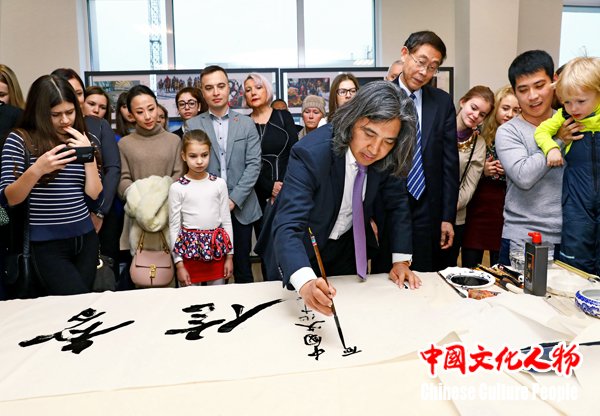 中国驻白俄罗斯大使崔启明,中国美术馆馆长吴为山,白俄文化部外联局长拉达贝丽斯卡娅,白俄罗斯国家文化联盟副主席国沙,明斯克中国文化中心主任张宏伟,以及白俄罗斯国立大学、白俄罗斯语言大学、白俄罗斯文化大学师生等一起展示吴为山创作的书法作品,共同庆祝明斯克中国文化中心成立一周年