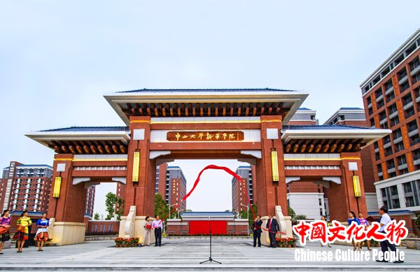 中山大学新华学院东莞校区西门落成揭牌,国学大师饶宗颐亲笔题写的校名镌刻在西校门上