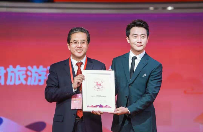 甘肃省文化和旅游厅党组书记、厅长陈卫中先生向甘肃籍著名演员黄轩先生授予“甘肃旅游形象大使”证书