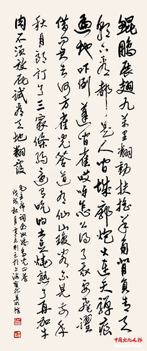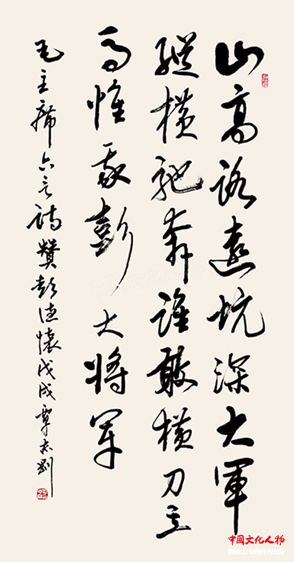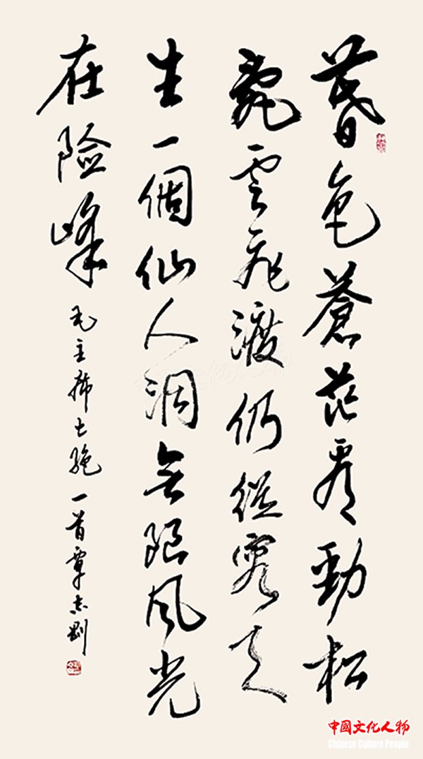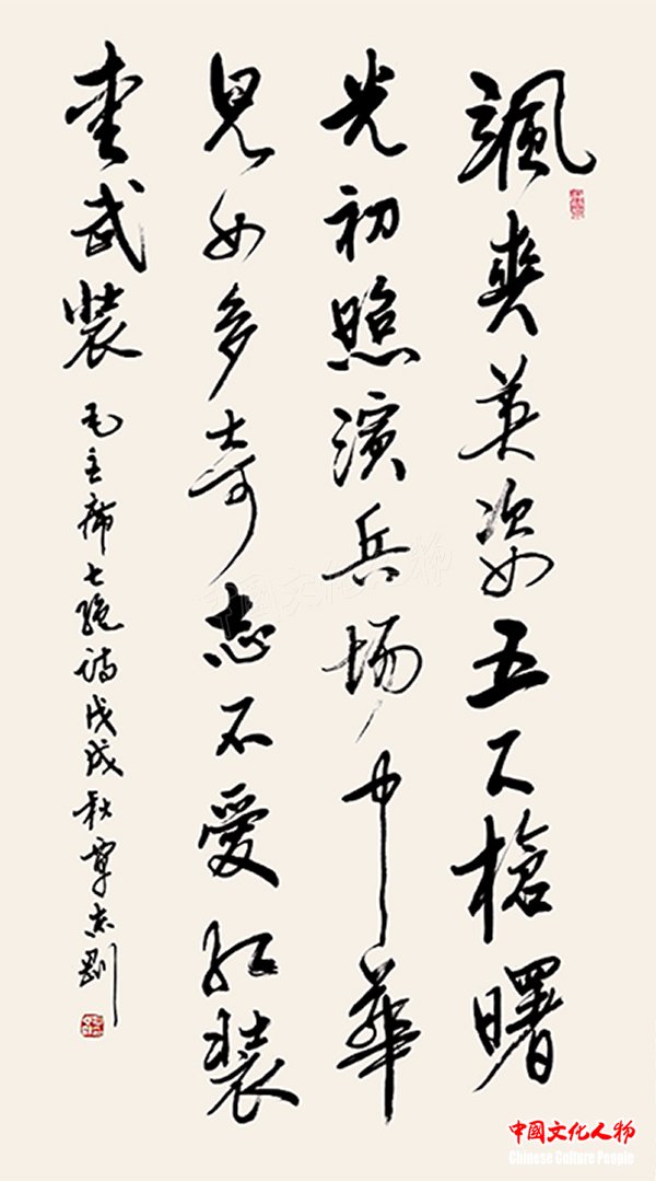 中国文化人物(主编 王保胜)为纪念毛泽东诞辰125周年,深切缅怀毛泽东同志的丰功伟绩,学习他的光辉思想、崇高品德和革命风范。由中央数字电视书画频道、中国文化人物杂志社主办的“激扬文字——纪念毛泽东诞辰125周年覃志刚书毛主席诗词书法展”将于12月25日在北京奥林匹克公园央视书画频道美术馆举行。