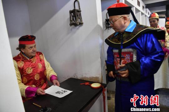 中新网四川阆中1月30日电 (记者 贺劭清)“各位举子随我来,请对号入座、严禁夹带,今天的试题是写‘福’字。”30日,金发碧眼的芬兰大叔杨勇身穿红色唐装,与来自泰国、马来西亚、韩国等国家和地区的家庭来到位于四川省阆中市的四川贡院,通过模拟赶考体验中国传统科举文化。