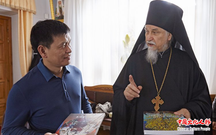 周昌新与普斯科夫洞窑修道院神父在一起交流