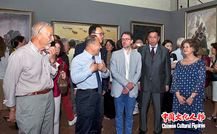 展览现场,韩玉臣向中国驻意大利佛罗伦萨总领事王文刚、意大利艺术研究院院长克丽丝蒂娜·阿齐蒂尼等出席开幕式的嘉宾介绍展览作品的创作历程