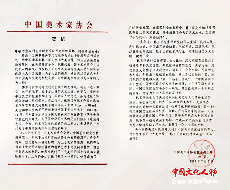 徐里在贺信中说:“佛罗伦萨作为意大利文艺复兴的发祥地,诞生了达·芬奇这样的艺术巨匠。今天,韩玉臣的展览无疑将进一步加深中意美术界之间的友谊。  韩玉臣是中国美协会员、中国美协油画艺委会名誉委员,他从事油画创作的道路十分独特而艰辛。他对艺术的热情萌生于青少年期间,但由于非艺术的原因,两次通过了中央美院的招生考试却未能顺利入学。坎坷的命运为他打开了另一扇门,使他成为了一名优秀企业家。在艰苦创业的过程中,韩玉臣始终没有放弃自己的艺术追求,10多年来,坚持深入生活,数十次到藏族地区,遇到过好多次险情,然而他始终锲而不舍、义无反顾。他通过认真观察体验、深入挖掘雪域民族的艺术价值、高原使命,把这种独特的思想、美学内涵,用现实主义表现形式表现出来。所以他的作品能够入选第十二届全国美展、中国油画百年回望展等最具学术水平的画展。韩玉臣从一个非职业的画家,跻身为中国著名油画家行列。”