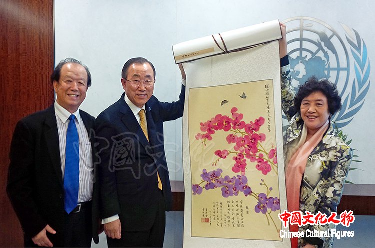 李前宽、肖桂云导演在联合国总部秘书长公办室向潘基文赠送画作