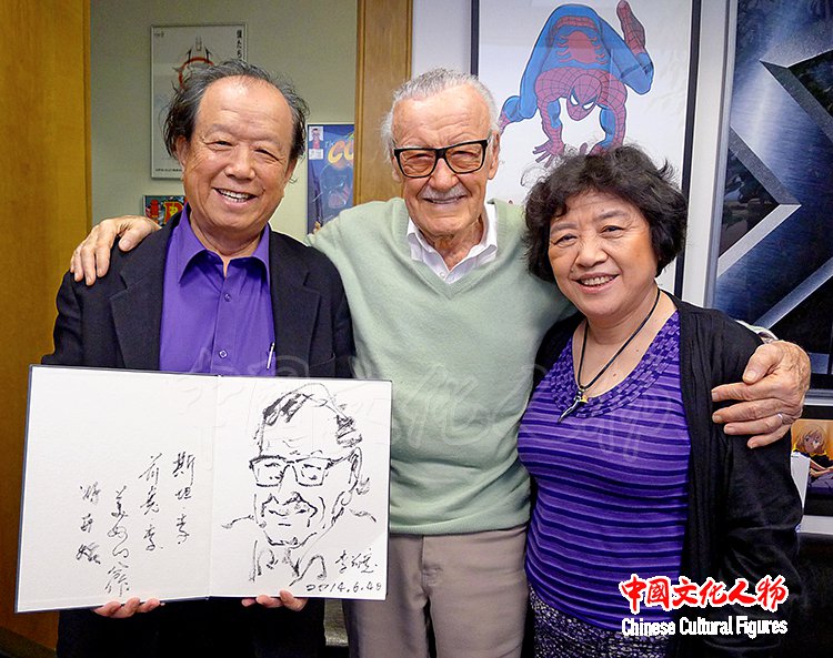 李前宽、肖桂云导演与在好莱坞编剧斯坦李办公室为他画像并合影