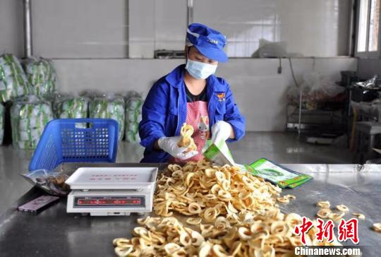 苹果加工厂的工人正在为苹果片装袋。 王磊 摄