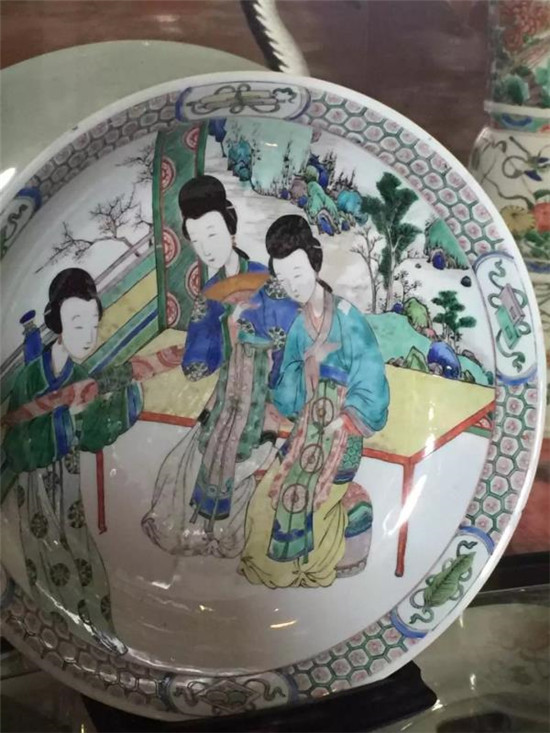 洪加祥在英国伦敦一家古玩店,鉴定康熙五彩人物盘。