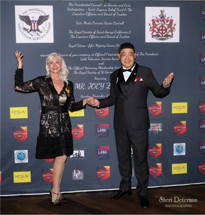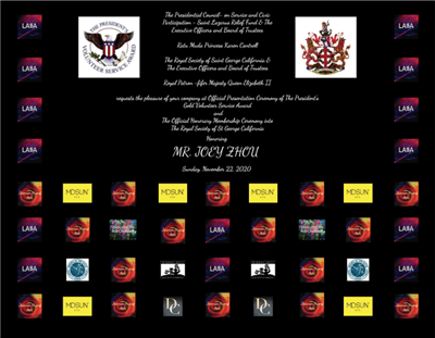 此外,就连在比佛利举办的“美国总统志愿服务奖”的背景墙,都选用黄建南的三幅油画为标识,数量多达32个,占了总标识44个的三分之二还多(如上图)。