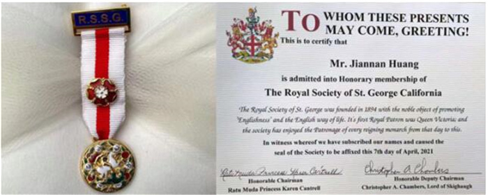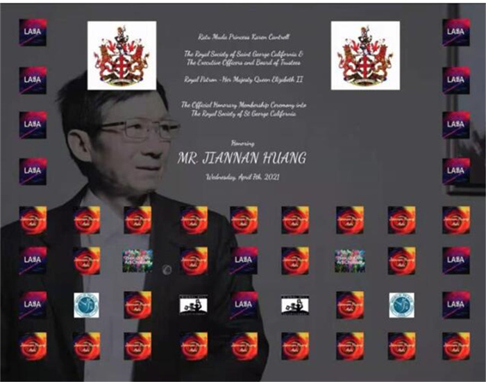 授勋仪式由三位英国皇家学会RSSG董事会主席团成员完成。其中,英国皇家学会加州主席凯伦·坎特雷尔公主颁发皇家学会的勋章,董事会成员克里斯托弗·钱伯斯颁发《荣誉会员证书》。由于疫情,黄建南先生不能亲自赶来领奖,英国皇家学会董事会主席团成员桑德罗·莫奈特代领奖章和《证书》。活动期间,包括世界知名新闻图片社阿拉米(Alamy)在内的各大新闻媒体与黄建南先生联线互动。