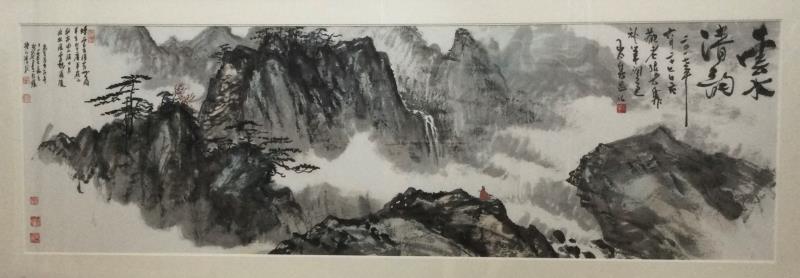 他画石头,峥嵘奇峻,其间云烟饱满,尽得散笔抱石皴的磅礴多姿、自然天成的技法,是其胸中自有气象。他画高士、渔隐、墨客、酒仙,又总行不由径,踽踽独行,是画工匠气之外的文人趣味。观其《云水清韵》图,众山环绕,浓墨欲摧,偏中间生出满溢的空无涤荡的云雾,一红衣高士携琴端坐,背对高瀑听水,或无所为之。他自题词其上,“烟云出没有无间,半在空虚半在山,我亦闲山消日月,出林深处听潺湲”。书画大家岑其先生观图,情不自禁,题字补笔,在此山水中平添了几棵古松。