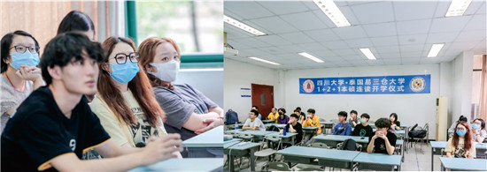 开学伊始,泰国易三仓大学首先向同学们分享了泰国教育尤其是易三仓大学的国际化教育,介绍了项目高起点、前瞻性、国际化特点,鼓励同学们好好学习,努力成为数字时代的国际化人才。泰国国家旅游局成都办事处专家还向同学们介绍了泰国国情,让同学们对泰国文化、泰国礼仪有了初步的了解。据悉,同学们在接下来的4年时间里,将在四川大学学习一年,到易三仓大学学习两年,通过强化教学完成本科阶段的学习;第四年在易三仓大学进行硕士阶段的学习。按规定完成学业,成绩合格,将获得易三仓大学颁发的学士和硕士学位证书。