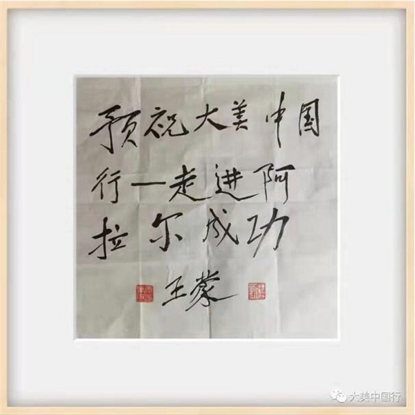 在“大美中国行”活动启动之际,文化部原部长,中国作家协会名誉主席、著名作家王蒙欣然题词:“预祝大美中国行-走进阿拉尔活动成功”,为参加活动的全体嘉宾壮行。王蒙著有长篇小说《青春万岁》《活动变人形》等近百部小说,其作品反映了中国人民在前进道路上的坎坷历程。曾获意大利蒙德罗文学奖、日本创价学会和平与文化奖、俄罗斯科学院远东研究所与澳门大学荣誉博士学位、约旦作家协会名誉会员等荣衔。作品翻译为二十多种语言在各国发行。2019年9月23日,王蒙长篇小说《青春万岁》入选“新中国70年70部长篇小说典藏”。