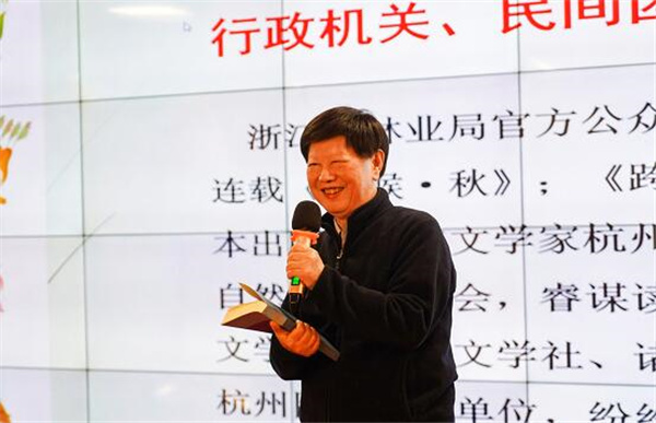 作者周生祥上台致词,他首先感谢青年文学家杭州作家理事会等单位主办这次活动,感谢中国民生银行杭州分行和潘登酒公司的大力支持,感谢今天来参加分享会的各位来宾。周生祥出生于浙江诸暨,上世纪七十年代末恢复高考制度,考进林业院校,毕业后分配到浙江省林业厅工作,从事林业调查规划设计。周生祥自称是个理科生,以前爱好的是数学,从事的是技术工作,做课题写论文是强项,文学创作想都没有想过。直到前几年提前退休自己创办公司,到各地爬山涉水,每到一处,拍张照片写点感悟,发在群里或朋友圈里,没想到得到朋友们的好评,鼓励着他越写越多,一直这样写了下来。到2019年时,将发在朋友圈里的文字整理出来,出版了长篇小说《跨界》和《天候·秋》。2019年下半年,完成了《天候》系列四部曲〔春、夏、秋、冬〕,2020年出版了《天候》合集。2020年,改写生态散文为主,断断续续写了150多篇,选取了其中的100篇出版了《润物》这本书。