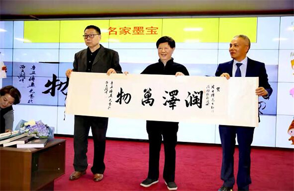 这些优秀朗诵家的朗诵,再现了《润物》的风采,也将这次分享活动推向高潮。下面的环节是八位知名书画家上台赠送墨宝,首先是傅通先老师上台,写的是“润泽万物”,傅老不仅是文学家,还是一位书法家。接下去是邹伟平上台,写的是“润物无声”,写得遒劲刚健,笔法端庄有力。后面依次是斯多林、周盛发、潘来福、陈波、楼意、赵玉泓上台,展示自己的书画作品,对《润物》作品分享会表示祝贺。