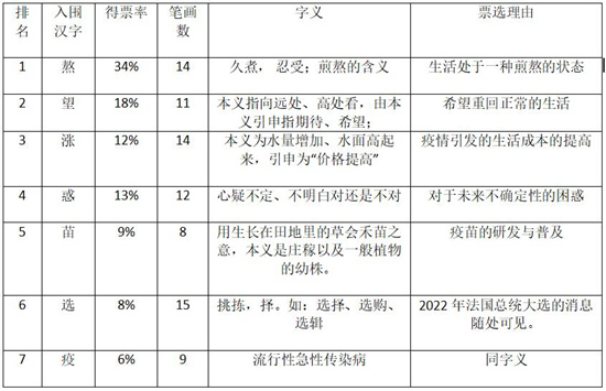 据了解,今年的征字活动筹备历时两个月(2021年10月至2021年11月),共收录了由法国网络用户提交的42个汉字,其中7个汉字由评委会筛选出,分别为(票数排名由高到低):