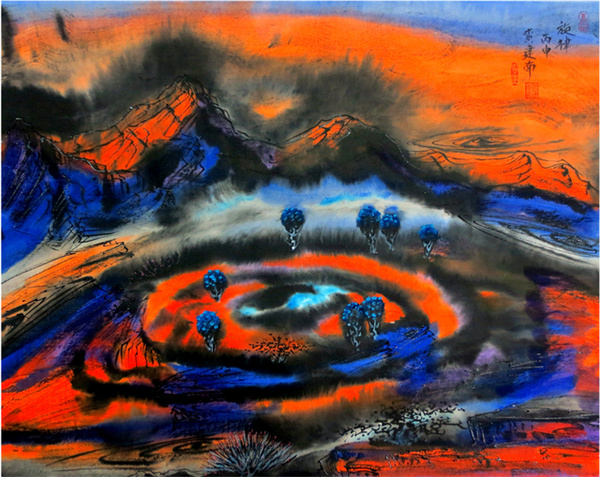 陈洪标指出,黄建南之所以与众不同,也在于他的中国画更是独树一帜,画风与传统的中国画迥然不同。在传统的中国水墨画中,加入了朝阳般火热的色彩,画面色感温暖,颜色斑斓,线条和用色都极为大胆,尽管大红大绿却没有一丝庸俗之气,反而充满活力和神秘感,呈现出某种超现实的奇幻色彩,令人耳目一新。