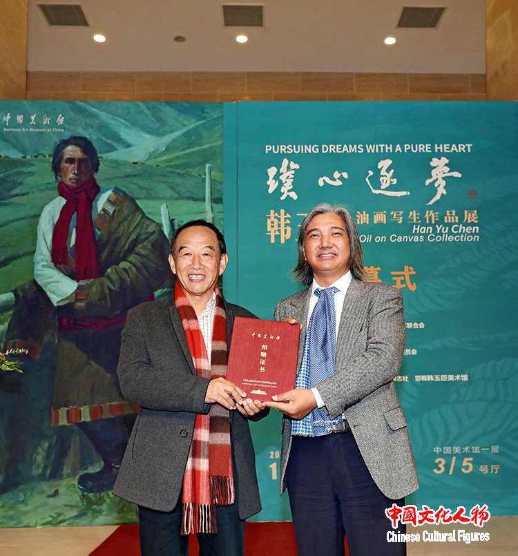 在“璞心逐梦——韩玉臣油画写生作品展”开幕式上,韩玉臣与中国美术馆馆长吴为山(右)共同展示韩玉臣向中国美术馆捐赠《甘南楞本刀吉》《光影》两幅油画写生作品的捐赠证书