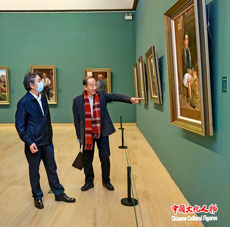 中国美术馆馆长吴为山(右)参观“璞心逐梦——韩玉臣油画写生作品展”时,对韩玉臣创作的讴歌人民、赞美生活、反映新时代大好河山的油画作品给予了高度赞赏