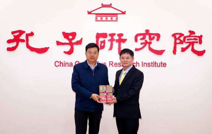 孔子研究院党委委员、副院长袁汝旭(左)还向曹明权博士(右)赠送了时任孔子研究院院长杨朝明编写的《孔子家语通解》《论语诠解》两本书后解释说,当年习近平总书记在视察孔子研究院时,看到这两本书后说:“这两本书,我要仔细看看。”并希望曹明权博士拿回韩国后也要好好研读一下这两本书,同时利用海外华文媒体的自身优势,将孔子文化精髓真正传播到海内外。据悉,2016年,《孔子家语通解》《论语诠解》由韩国学古房出版社正式出版韩文版。