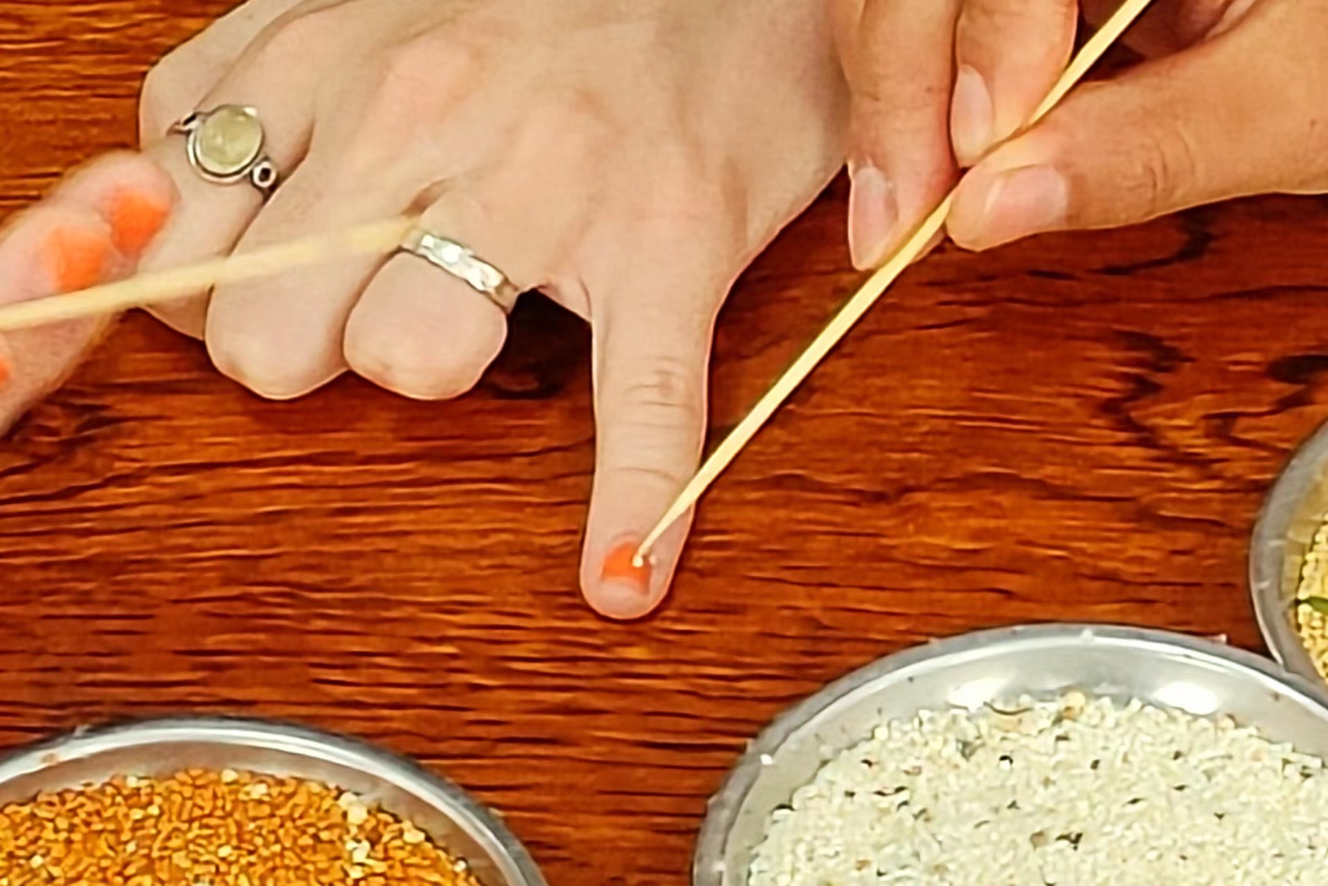 在五谷画制作技艺非遗工坊,土库曼斯坦留学生唐一泓用竹签沾上胶水、黏住谷粒,仔细地填充图案。法国知名博主乐盖曦则别出心裁,以小糯米粒做成花瓣,粘在指甲上。