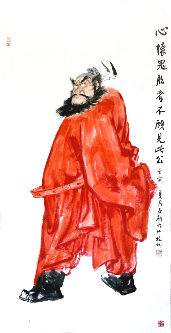 本世纪初,焦亚新转业到地方文联成为专业画家,这时焦亚新的版画、油画创作是很有建树的,在高级别的美展和大赛中获了不少大奖,有的还获得全国美展铜奖。但他特别喜欢中国水墨人物画,虽然版画、油画和中国人物画有一定的共性,但从版画、油画转入水墨人物画具有一定的挑战性。他为了实现自己的艺术理想,毅然到中国美院进修深造,把中国水墨人物画作为再攀登的主攻方向。这是一次悲壮的凤凰涅槃和痛苦的自我否定。他割舍一些轻车熟路技艺,腾出更多的空间纳入新的艺术营养。他认识到中国画是意象之艺术,所以,在国美完成学业后焦亚新作品的面貌焕然一新,他的作品洗练凝重,浑厚典雅,艺术上追求的是意境、神采、气韵,力求实现“传神写照”“立象以尽意”的艺术效果。所以他爱画钟馗,他的钟馗画立意高远,笔墨随性,挥洒尽意,个性鲜明,即寄托了广大人民群众对幸福生活的向往,也达到了一定的祛除邪恶,惩戒腐败的宣传效果。