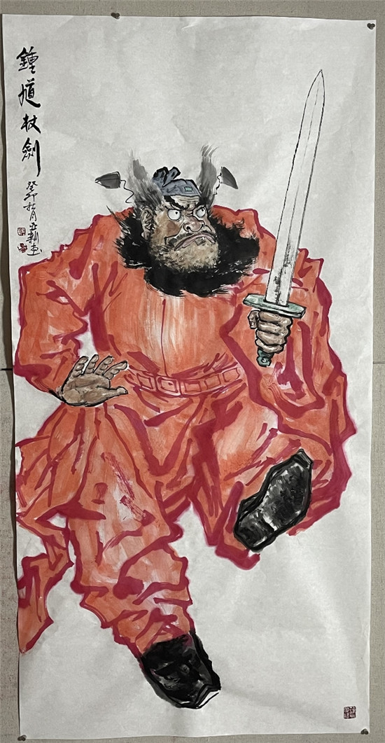 钟馗画的色彩也是钟馗画成功的关键。色彩是由于物体上物理性的光反射到人眼视神经上所产生的感觉,钟馗画的色彩也是钟馗画成功的关键。自唐以来,一直追摩延承盛唐画风,以墨线勾填,施朱敷丹,惊彩绝艳。焦亚新对于钟馗服饰色彩,汲取参考了灵璧钟馗画的特色,摈弃了世俗的大红大紫,独辟蹊径,基本上采用以朱砂色红为主基调。中国画中的朱砂色,是类似色谱中的橙色偏红,这种浓重强烈的朱砂红给人以震撼的视觉冲击效果,浓郁的色彩表现出了雄浑的意境和钟馗刚烈劲拔的气势,营造张扬、奔放、热烈的气氛,能引起观众的共鸣。朱砂红给人亲切、坦率、开朗、健康的感觉,是浪漫中带着成熟的色彩,但若是搭配不好,也会陷入世俗气。所以焦亚新每次上色时总是举轻若重,小心翼翼。