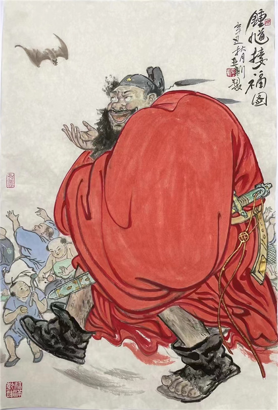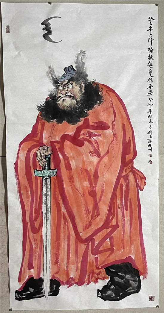 焦亚新的家乡在安徽,灵璧钟馗画,让他耳濡目染中国传统的民间绘画。他的钟馗画采用传统的色彩和笔法,结合了现代的技法和造型,在他笔下钟馗的形象不仅具有神秘和威严的一面,更为重要的是,他的钟馗画体现了人性光辉和价值观。