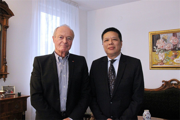 世界和平丝带组织副秘书长兼波兰总干事杜国勇(右)拜会匈牙利前总理迈杰西(左)。
