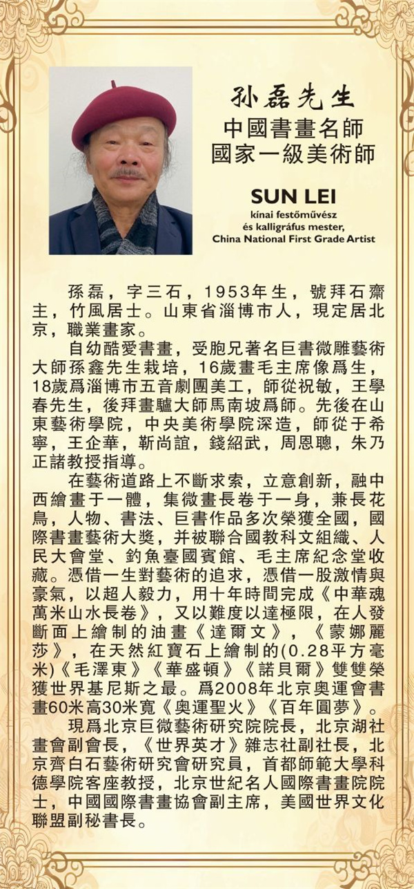 1月5日至12日,孙磊先生书画展在匈牙利首都布达佩斯成功举办,接下来计划在波兰、奥地利、法国、捷克和克罗地亚等地继续举行书画展。