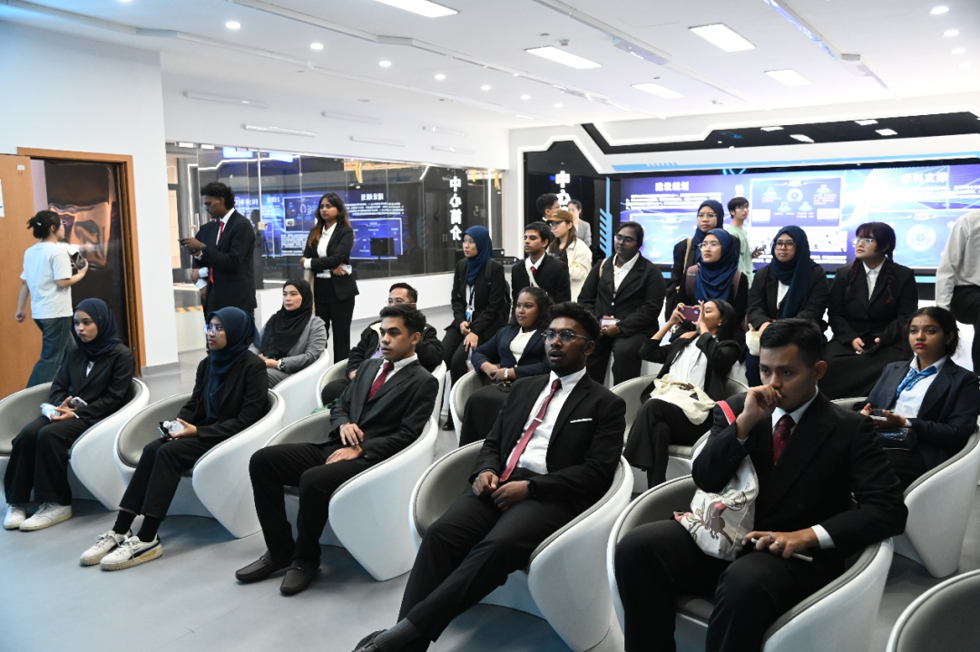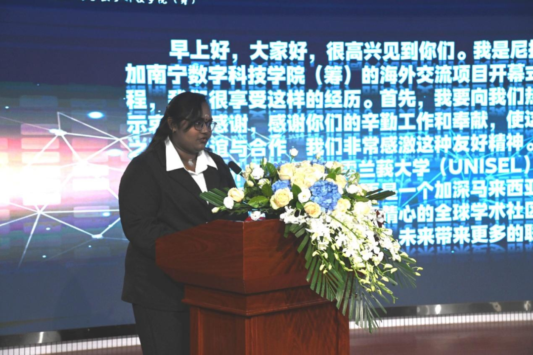 研学团学生代表尼提亚斯里·奇塔拉斯在发言中表示,此次海外研学项目将会是一次充满意义的学习、探索之旅,她和同学们都十分珍视和期待这次研学活动。这不仅仅是一个知识共享的平台,更是加深马来西亚青年和中国青年之间相互理解和彼此尊重的宝贵机会。感谢数科院师生的辛勤工作和奉献,使这个项目成为现实。希望未来两校的关系能够继续蓬勃发展,带来更多的联合项目和成果,也希望研学团的同学能充分利用这个机会,勇敢地迈出舒适区,深入参与交流,全身心投入到这次体验中。