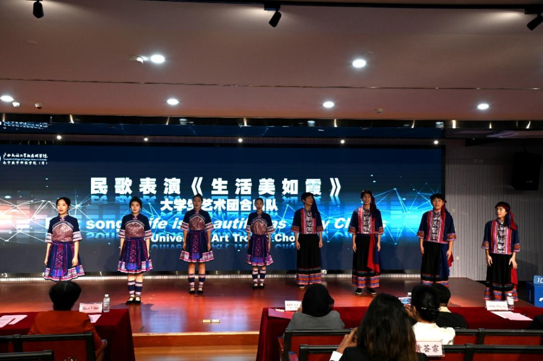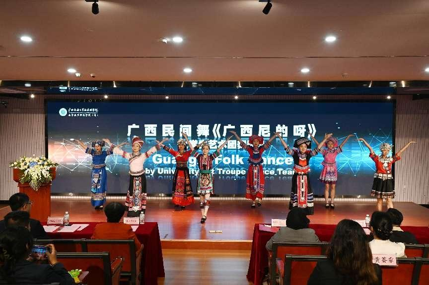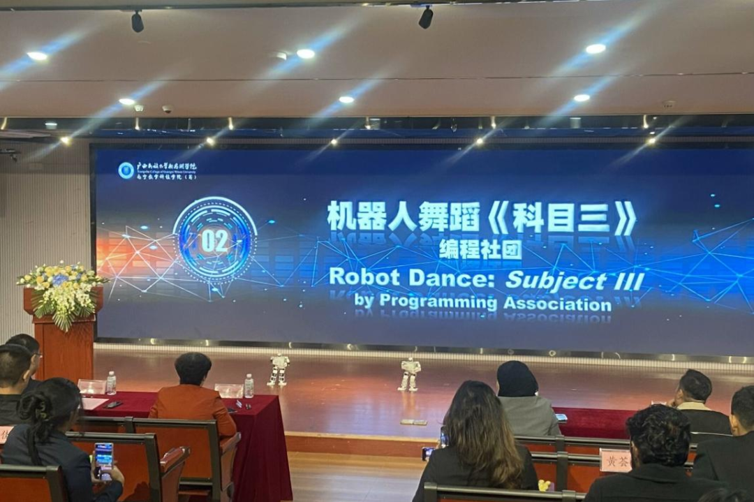 广西民族歌舞《广西尼的呀》和《生活美如霞》拉开研学团开班仪式的帷幕。大学生艺术团的同学们身着五彩壮族传统服饰,舞者环佩叮当、姿态翩翩;歌者天籁之音、绕梁不绝,以广西少数民族独特的仪式和文化韵律欢迎海外来客。我校理工学院的机器人为观众们带来了别具一格的舞蹈——《科目三》,展示了我校科技与艺术结合的成果。