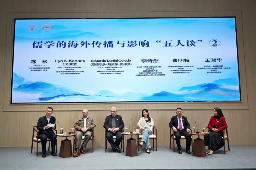 儒学的海外传播与影响“五人谈”分为两组,第一组由南京大学特任副研究员、香港中文大学哲学博士、美国加尔文大学访问学者赵妍妍主持,山东大学儒学高等研究院教授、博士生导师郭萍,2025“齐鲁访学驻研计划”访问学者、韩国西江大学宗教学系主任、韩国宗教学院院长金在荣,尼山世界儒学中心学术研究与文献期刊部副研究员王淑琴,美国华尔街先驱报总编辑陶琳,加拿大红枫林传媒总编辑姚风明担任访谈嘉宾。第二组由孔子研究院科研管理部助理研究员陈松博士主持, 2025“齐鲁访学驻研计划”驻研学者、山东大学儒学高等研究院学者、孙子研究院特聘教授Ilya A. Kanaev(汉伊理),2025“齐鲁访学驻研计划”访问学者、阿根廷科技研究委员会研究员、罗萨里奥国立大学教授Eduardo Daniel Oviedo(爱德华多·丹尼尔·奥维多),2025“齐鲁访学驻研计划”访问学者、韩国成均馆大学东亚学术院博士后研究员、韩国研究财团人文社会研究教授李诗然,韩国全国韩籍华人总联合会总会长、韩中新闻记者协会会长、韩国新华报社社长曹明权,西非统一商报副社长、西非暨尼日利亚中国和平统一促进会副会长、尼中友协副会长王淑华担任访谈嘉宾。