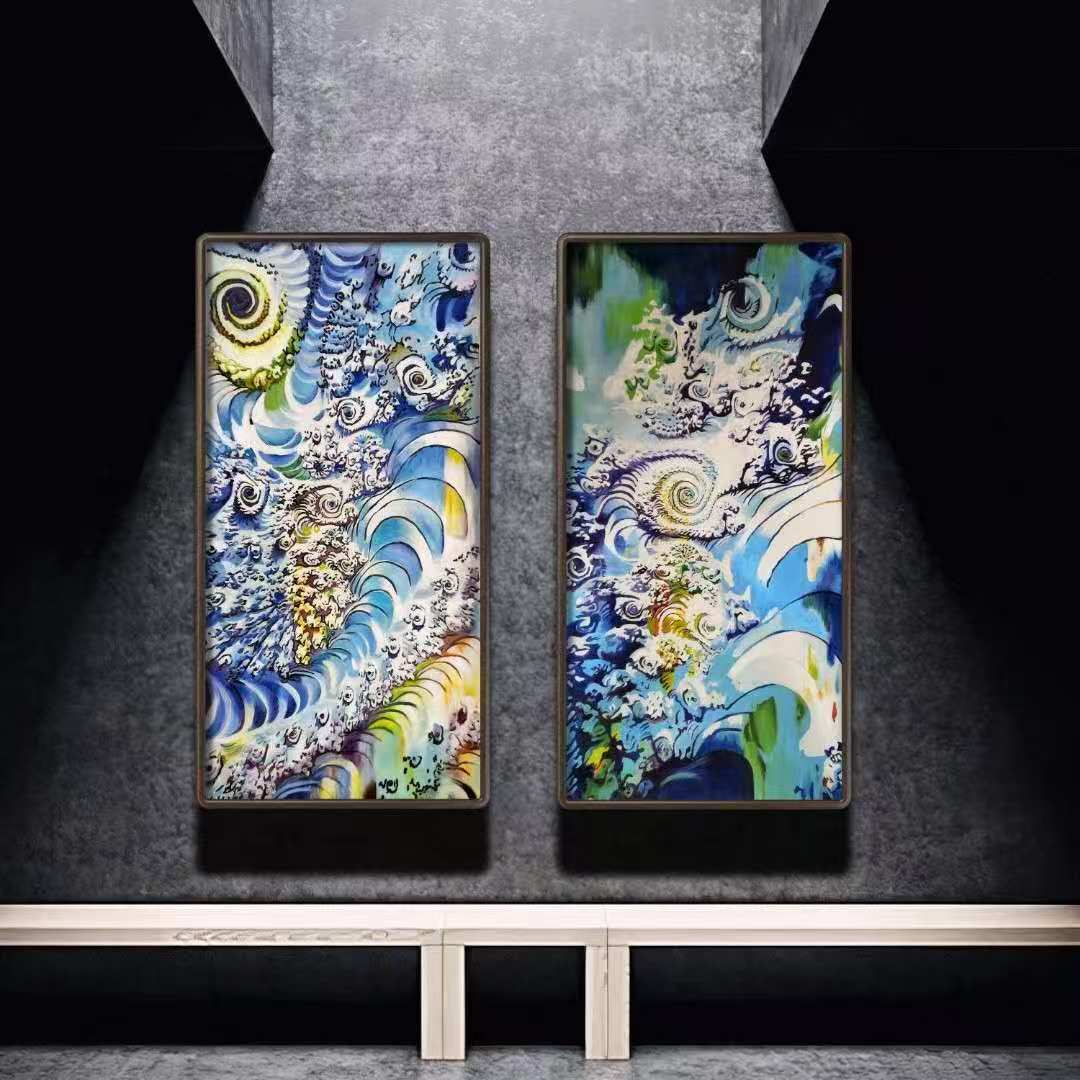 而“将科学概念融入绘画肌理”,使她的作品在视觉上呈现出极强的动态张力。《蓝眼睛》系列以科学概念为原点,结合厚涂技法与象征主义结构,建构出一种“触觉性”的宇宙意象系统。作品中量子色层、能量流动与光线处理,带有明显的方法论实验色彩。中国工艺美术大师葛军指出:“这种融合艺术与科学的跨界方法论,已经不只是风格探索,而是对视觉艺术‘语法体系’的一次结构性贡献。”
