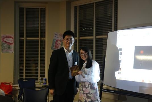 在竞猜环节,获得奖品金丝楠手串的同学同曹荻明合影