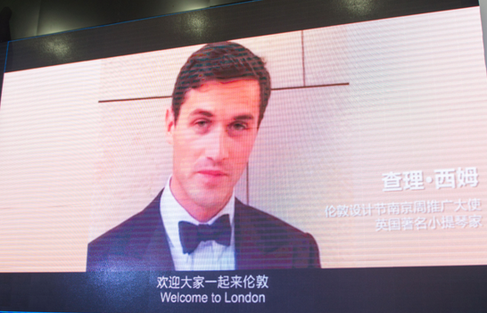 授牌仪式后,主屏幕上播放了英国著名小提琴演奏家查理席姆先生的就任2016伦敦设计节“南京周”推广大使的感言视频。他表示非常荣幸能够担任推广大使,在他的心目中南京是一座在艺术设计文化领域有深厚文化底蕴的东方古都,他将在伦敦设计节“南京周”期间向各界推广南京的文化和优秀的设计产业。