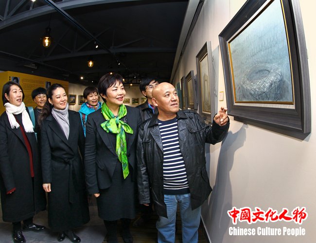 清华大学美术学院绘画系主任郑艺向北京慧语文化董事局主席郭翠萍,中国美术家协会艺委会工作部副主任贺绚等参观展览的领导及嘉宾介绍展览作品