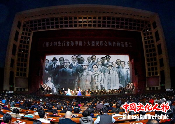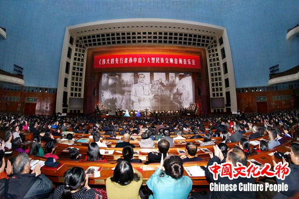纪念孙中山先生诞辰150周年大型民族交响音画音乐会《伟大的先行者孙中山》于12月8日在北京人民大会堂隆重上演,来自海内外的华人华侨、青年艺术家和首都各界群众一起观看了演出