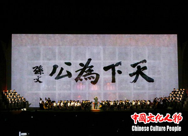 人民大会堂座无虚席,来自海内外的华人华侨及青年艺术家和各界群众在悲壮雄浑的交响声乐中,在盎然飘逸的动感水墨里缅怀孙中山先生为民族独立、社会进步、人民幸福所建立的历史功勋