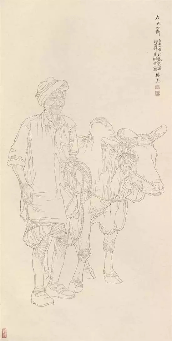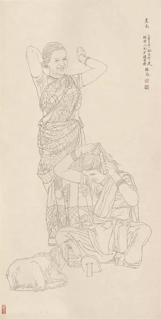 这次与白描的意外遭遇让杨光利体味到了素的华彩和力量,也使他对白描人物的艺术魅力有了充分的认识。所以,当杨光利面对四次赴印度写生的资料和上万张图片想进行总结创作时,他想到了白描。