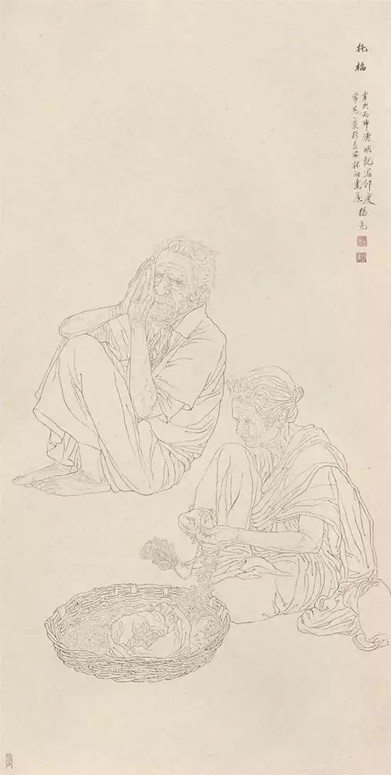 它同时也带来了一种全新的审美体验。没有色彩和光影的强烈冲击,你如同走进了一间光线很暗的房子,需要静下心来慢慢地让你的眼睛开始适应你与画的距离。一点一点,逐渐清晰,然后在一个合适的距离,你停下来,静静地凝视。慢慢地,那些线条就开始游动起来,通过这些线条,人物的形象生动起来。你看得见那些皱纹、那些姿态、那些表情……他们或站或卧,或行或思,在画面上完成着他们的故事。你只需做一个观众,去静静地看、静静地听,静静地感受。